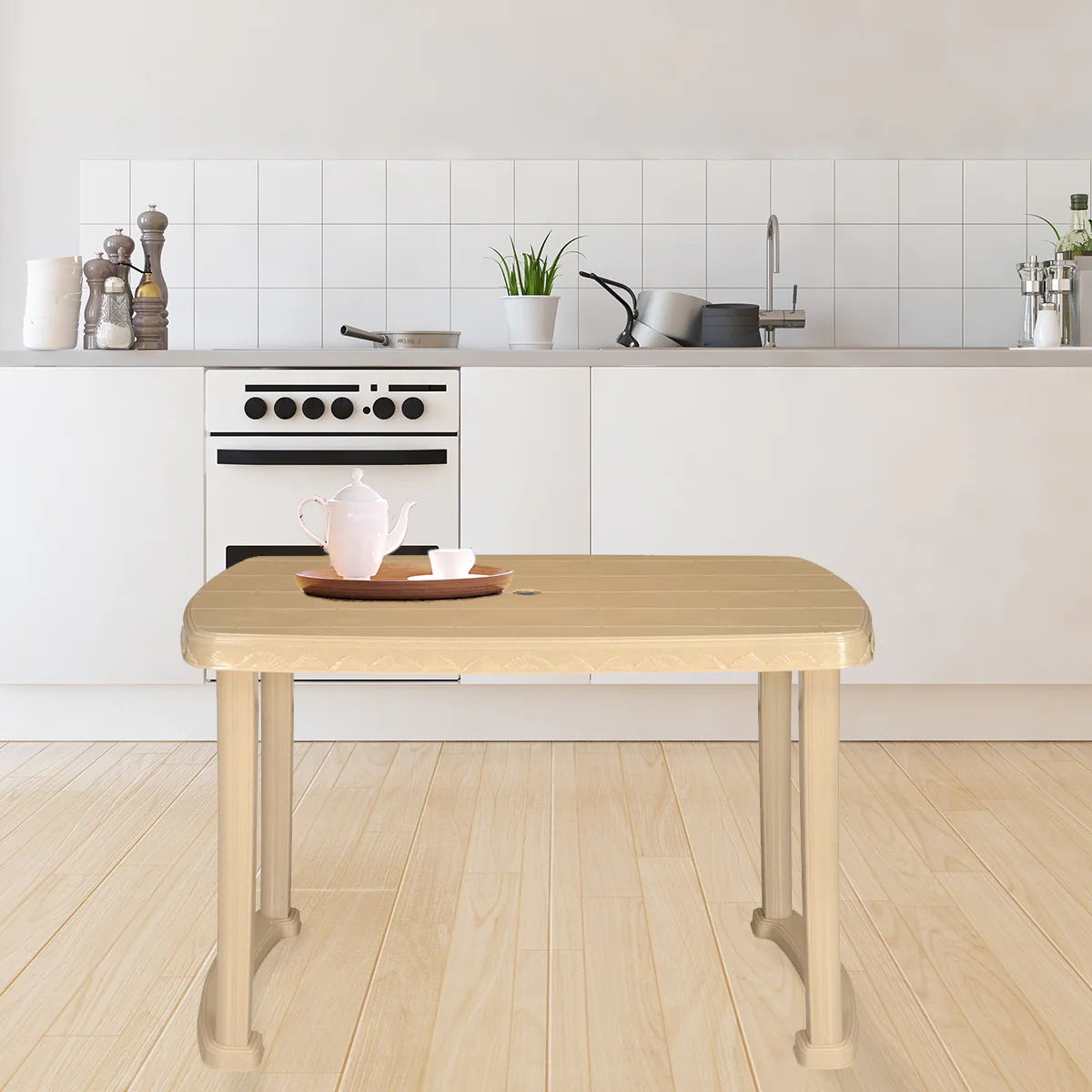 Dining table is rectangular in shape. The dining table set is made of good quality plastic which makes it durable and strong. The table is light in weight and is sufficiently spacious to properly hold a large number of plates and dishes. With a neatly polished surface, it definitely gives your decor a classy touch, suitable for your family meals or even when you have guests over.