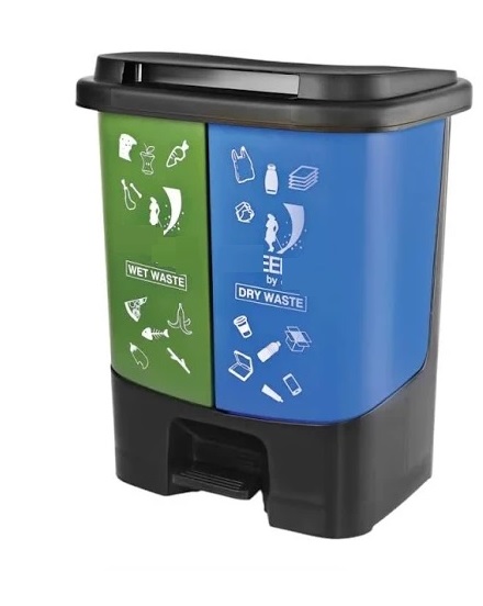 Twin bins for separate wet & dry garbage.Twin bins with individual bin handles for separately disposing waste & cleaning.Pedal for hands free waste disposal.Tight lid to prevent odour & insects.color code as per waste management rules 2016.Segregation at sourceDurable & long lasting.100% recyclable environment friendly.Weather proof.Easy to m· 100% recyclable environment friendly