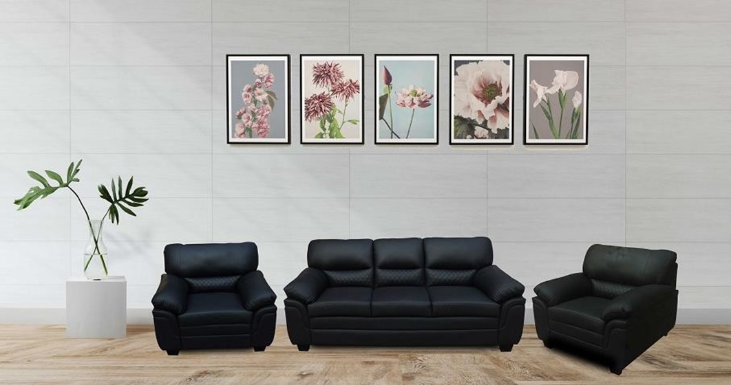 Half Leather sofa ( Pure leather in touch point and syn leather in non-touch points) in black shade, it is available in 1 seater and 3 seater. Mid back sofa with plush backrest and fluffy armrest, soft foam at seat makes the sofa extremely comfortable with sinking feeling at seat. Quilts at lumber support evokes a touch of sophistication with premiumness.