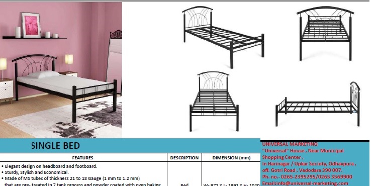 Elegant design on headboard and footboard.• Sturdy, Stylish and Economical.• Made of MS tubes of thickness 21 to 18 Gauge (1 mm to 1.2 mm)that are pre- treated in 7 tank process and powder coated with oven baking.• Floating bedstead (made of rods) – hence completely knockdown.design and easy to transport.• Mattress size – 36 inches x 75 inches.